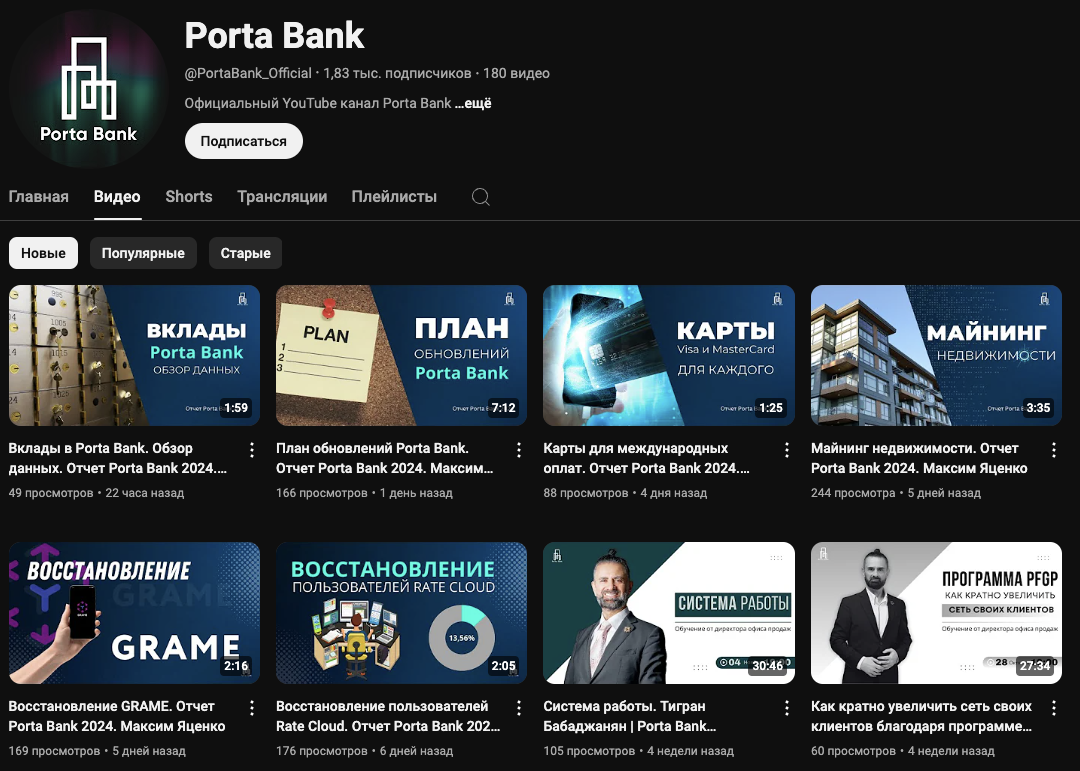 У проекта есть и канал на YouTube – PortaBank Official. На него подписано около 1,83 тысяч пользователей. Ролики на канал стали выкладывать более года назад. За это время было опубликовано 180 видео.