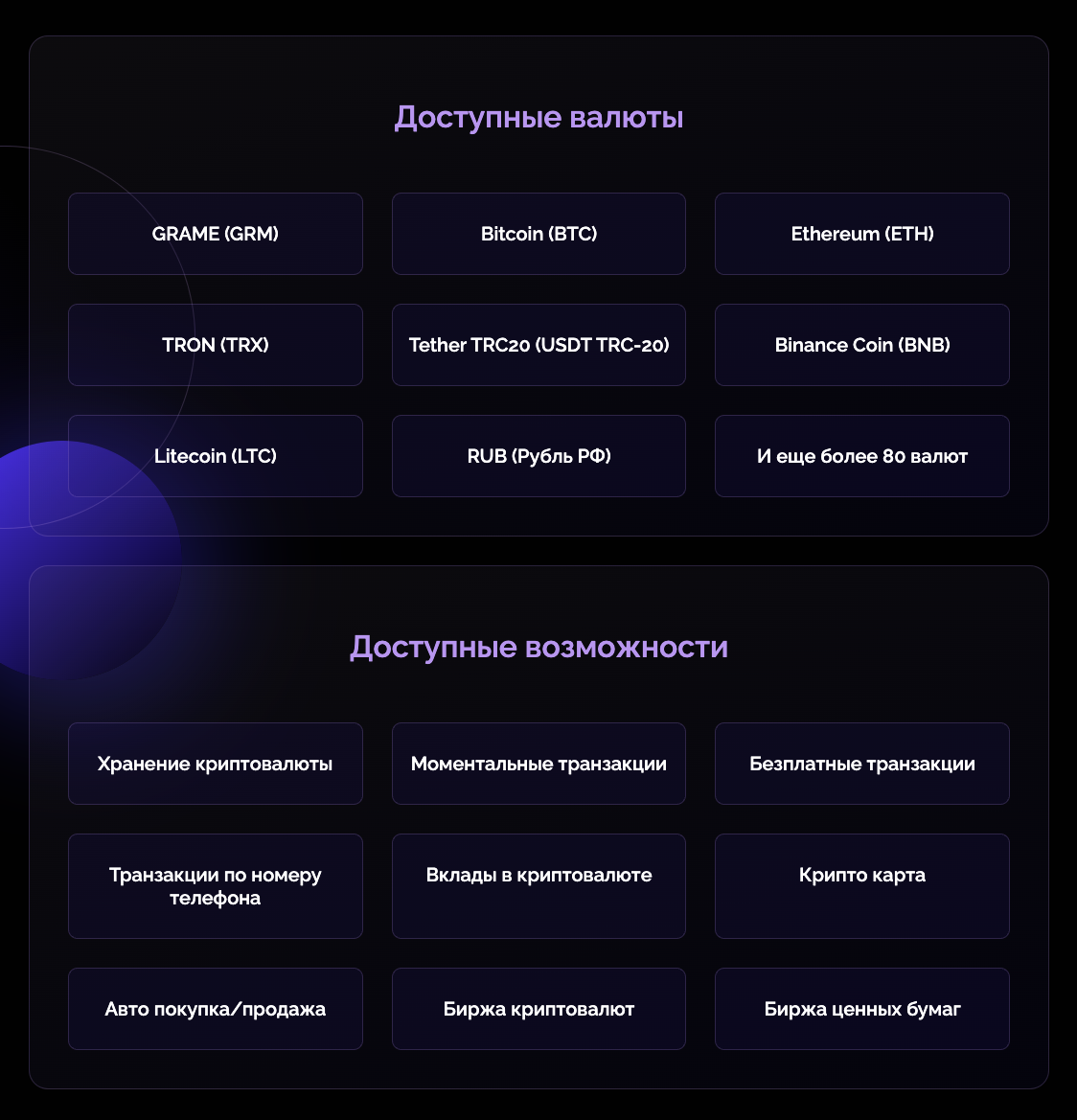 Кошелек поддерживает свыше 80 валют. Среди них: Bitcoin, Grame, Ethereum, Litecoin и другие. Также есть функция «криптокарты», при помощи которой можно удобно оплачивать товары и услуги криптой.