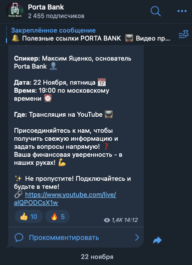 На телеграмм-канал Porta Bank, porta bank official, на 4 декабря 2024-го года, подписано около 2,45 тысяч пользователей. Публикации просматривают в среднем 500-1500 раз.