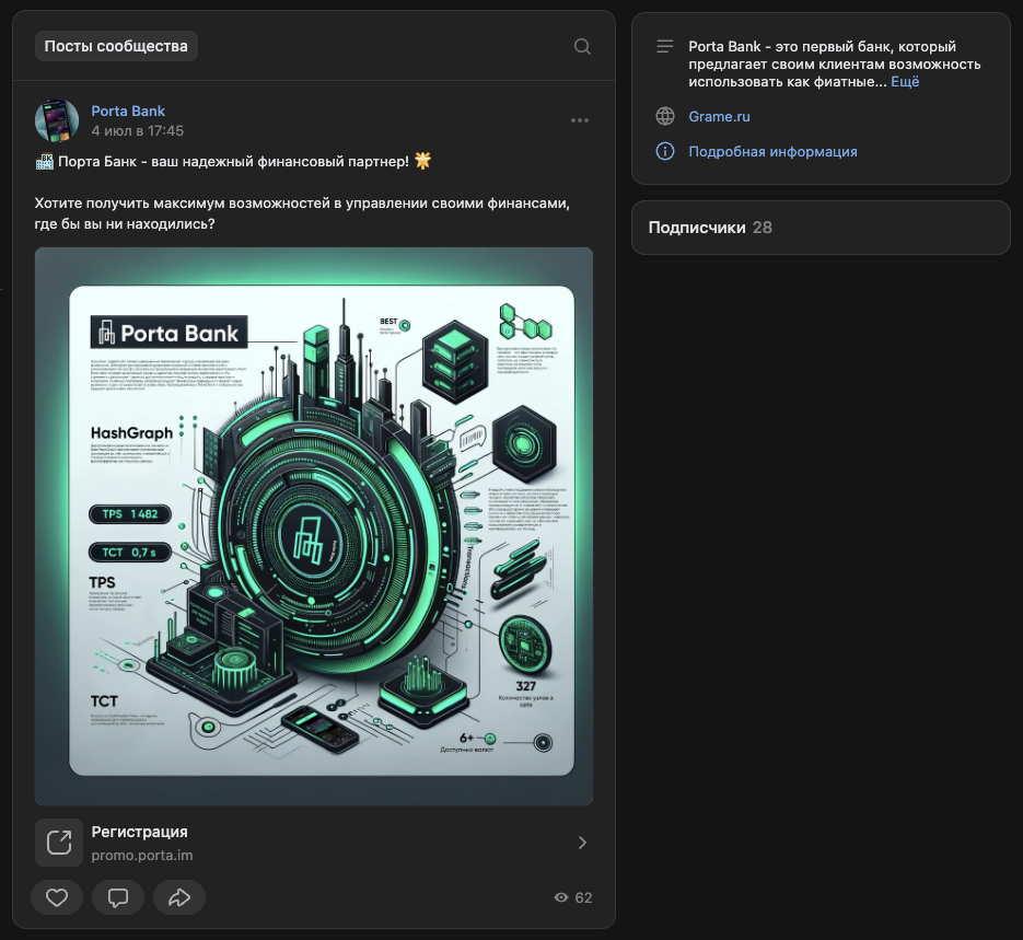 На страницу PortaBank во «ВКонтакте» подписано всего 28 человек. Последние публикации в ленте аккаунта просмотрены 50-70 раз. Новый контент на странице не выходит с середины лета 2024-го года.
