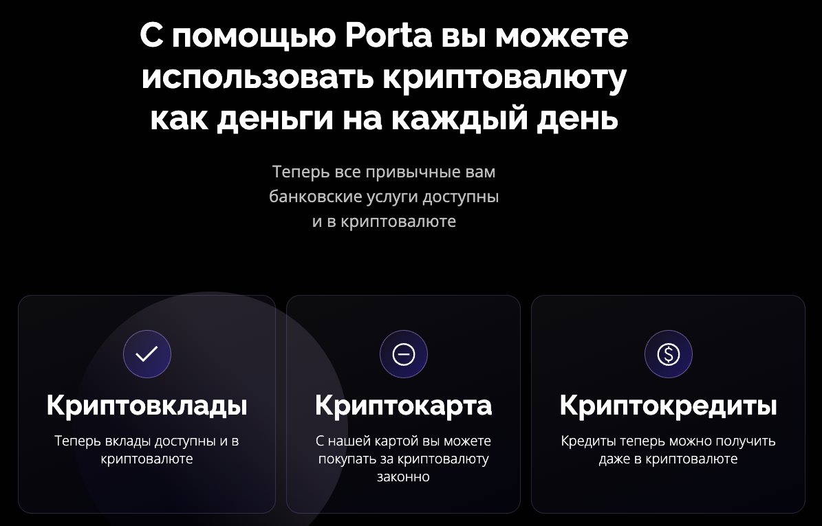 Porta Bank – крипто-кошелек, который имеет функции банка. Появился более года назад. В приложении можно не только хранить цифровые активы, но и занимать деньги, а также давать их взаймы.
