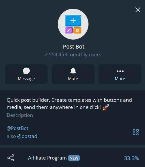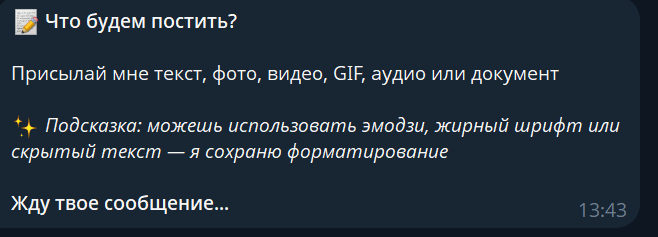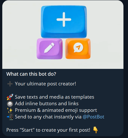 Postbot насчитывает более 2,5 миллионов ежемесячных пользователей. Платформа предназначена для создания и управления постами в Телеграме. Участники могут формировать сообщения с полным сохранением форматирования. Пользователь может отправлять боту фотографию, видео или документ, после чего система объединяет эти элементы в единый пост.