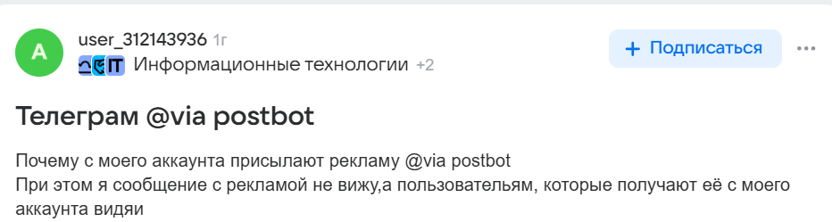 Иногда участники замечают, что рекламные сообщения с подписью via PostBot приходят от их собственного аккаунта. При этом сам отправитель не видит этих сообщений в своей переписке и не совершает таких действий.