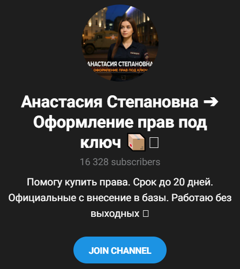 Анастасия Степанова завела свой канал в Телеграмме в марте 2025 года. Она ничего о себе не рассказала, а с первого же поста начала предлагать купить через нее права с проведение по базам.