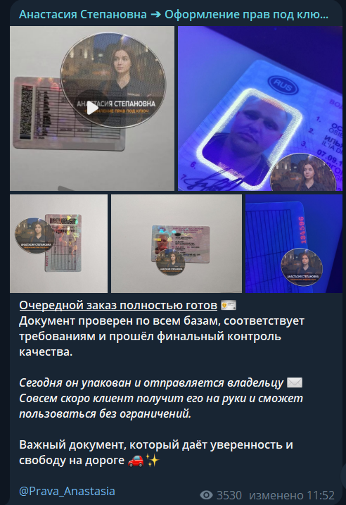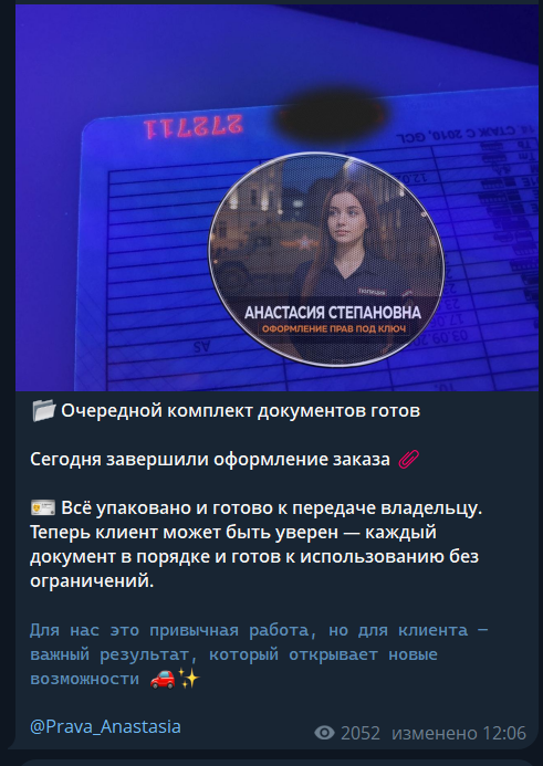 В Телеграмме есть немало каналов, на которых предлагают купить права, все они занимаются разводом на деньги. То же касается и канала Анастасия Степанова оформление прав под ключ.Судя по отзывам, после обращения клиента ему выставляют ценник и получают оплату. После этого никакие права не приходят, а в переписке жертву просто блокируют.