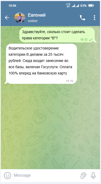 В ходе проверки выяснилось, что все детали «продажи» водительских прав Евгений обсуждал с каждым клиентом индивидуально в личных сообщениях. По нашей информации, стоимость документа составляла 25 тыс. руб. При этом клиент сразу должен внести 100% предоплату, отправить свою фотографию и паспортные данные. Это уже само по себе крайне опасно: человек передает личную информацию незнакомцу, не получая взамен никаких гарантий.Важно также понимать и другой момент: покупка водительских удостоверений — это серьезный риск и нарушение действующего законодательства. Использование поддельных документов грозит уголовной ответственностью, такие «права» не числятся в базах, их нет в «Госуслугах», при любой проверке они сразу вызовут вопросы у инспекторов. По сути, человек рискует не только деньгами, но и своей свободой.