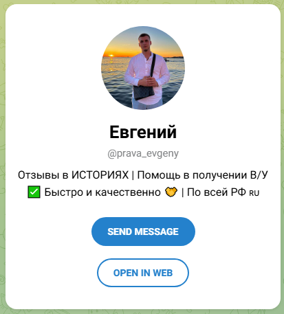 По имеющейся из открытых источников информации, ТГ-аккаунт Prava Evgeny принадлежит некоему Евгению. Он администрировал паблик «Права через Телеграмм», который на момент написания обзора в декабре 2025 года удален. На своей странице мужчина рассказывал, что имеет отношение к МВД и ГИБДД, поэтому может легко посодействовать в получении водительских прав. В качестве доказательства он прикреплял фотографии готовых документов.