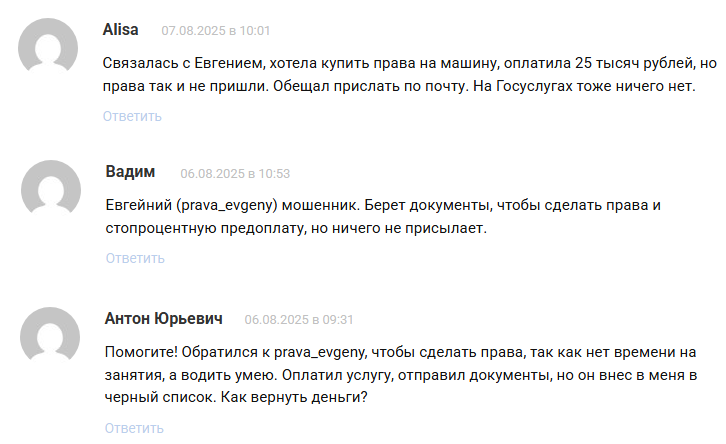На независимых площадках мы нашли много негативных комментариев об этом ТГК. В них люди пишут, что переводили Евгению деньги в надежде получить водительское удостоверение, но в итоге остались ни с чем.