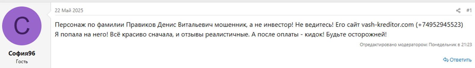 Но вот отзывы реальных людей о Правикове Денисе Витальевиче на форумах далеко не такие радужные. Пользователи уверяют, что перед нами очередной мошенник, который вымогает деньги.