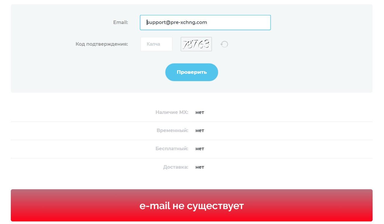 Для связи со техподдержкой указан несуществующий контакт в Телеграме – telegram и фейковая электронная почта – support@pre-xchng com.