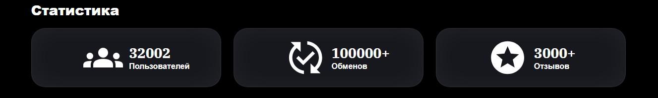 В футере сайта прописаны годы работы обменника – 2020-2025. Еще приведена статистика: более 32 000 людей пользуются сервисом, свыше 100 000 обменов выполнено и более 3 000 отзывов оставили клиенты. Но это тоже обман.