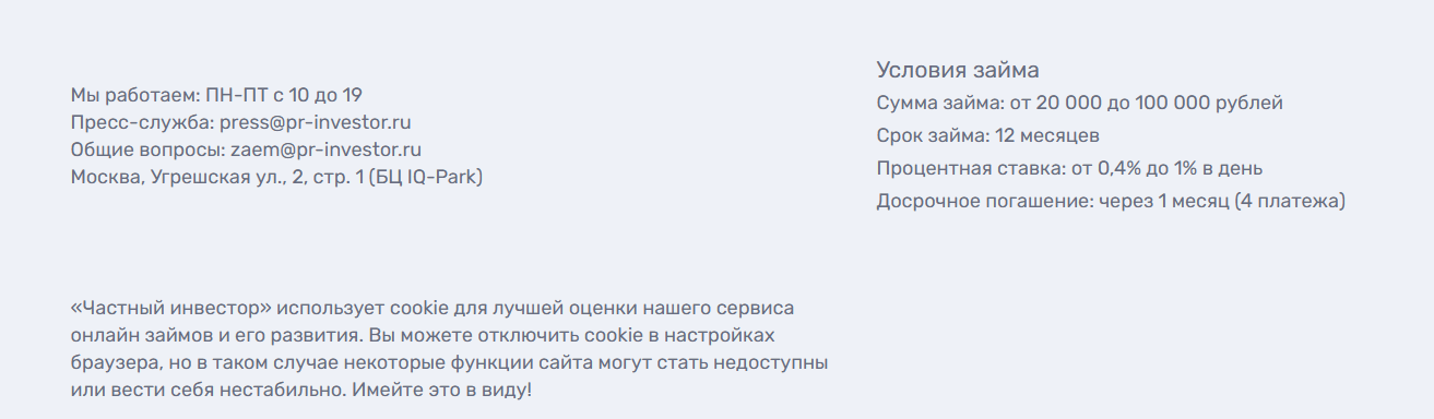 Перед обращением за деньгами в организацию важно обратить внимание на репутацию и опыт работы на рынке. Платформа “Частный Инвестор”, которая имеет адрес Pri Invest Ru была зарегистрирована лишь 2 месяца назад, а официально МФО нигде в списках не числится. Поэтому договор может заключаться с частным лицом, а не компанией. Лицензии / сертификата и прочих документов, кроме пользовательского соглашения, на странице нет.