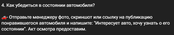 В ответах на часто задаваемые вопросы Lux Car Sale в Telegram указано, что предоплата за сам автомобиль не требуется, но клиент должен оплатить пошлину на этапе растаможки. Экспедитор якобы должен прислать видео, чтобы доказать реальное существование авто.