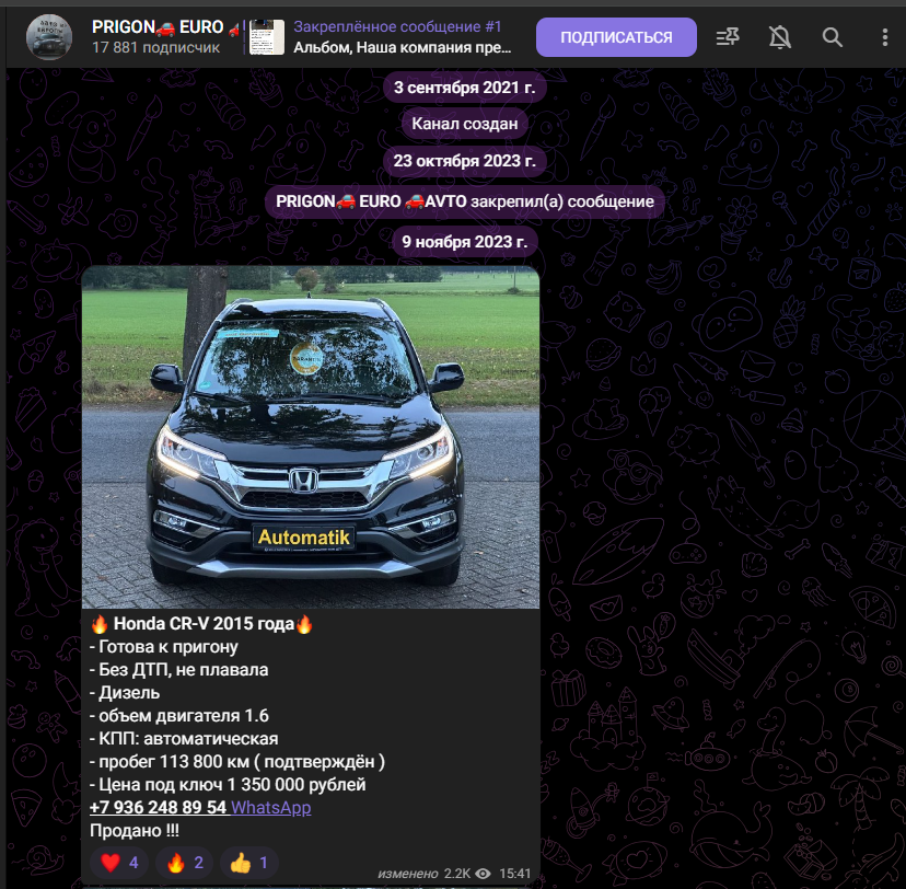 В случае возникновения каких-либо проблем с состоянием авто, AvtoSpec Denis обязуется выполнить полный возврат средств или произвести равноценную замену самого авто. Админы предупреждают, что с пробивкой VIN-кода могут возникнуть проблемы якобы из-за санкций РФ и РБ – автомобили не отображаются в автотеке из-за того, что пока не были эксплуатированы на территории России.На сентябрь 2025 года на телеграмм-канал подписалось почти 18 000 человек, но куда меньшие охваты постов AvtoSpec Denis указывают на вероятную накрутку аудитории. Комментировать записи на канале нельзя, копирование текста из постов также закрыто настройками. Для подписчиков доступны только быстрые реакции.