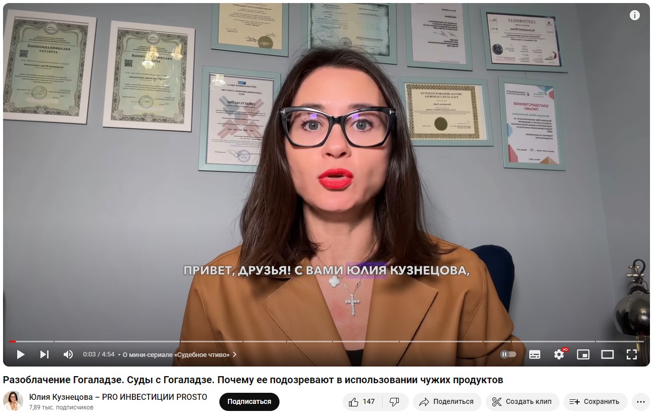 С Гогаладзе судятся владельцы других подобных школ, утверждая, что она ворует у них контент. Неизвестно, чем заканчиваются эти суды. Они же записывают разоблачения Ольги Гогаладзе и Профинансы ру, но претензии сводятся только к плагиату.