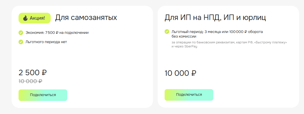 Чтобы подключить Prodamus, придется выложить 10 тыс. руб., но для самозанятых часто бывают льготы и скидки от 2,5 тыс. руб. В первые месяцы у новых клиентов иногда действуют акция с комиссией 0%. Для начинающего микробизнеса такие тарифы могут оказаться слишком высокими, но если обороты стабильные, сервис становится выгоднее.