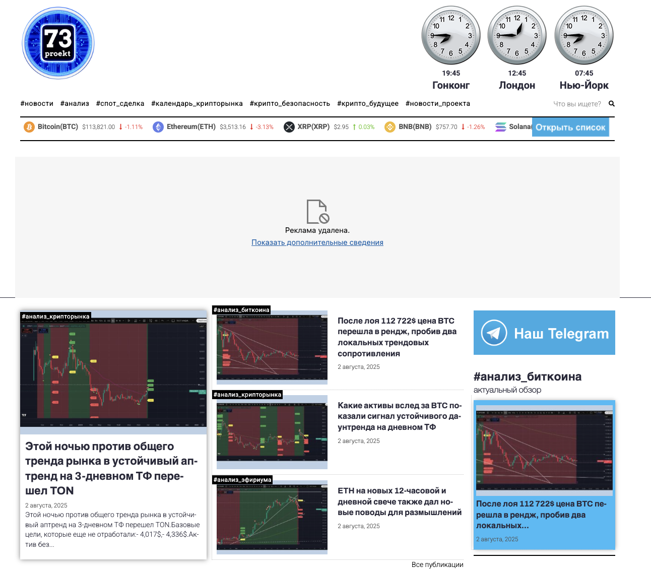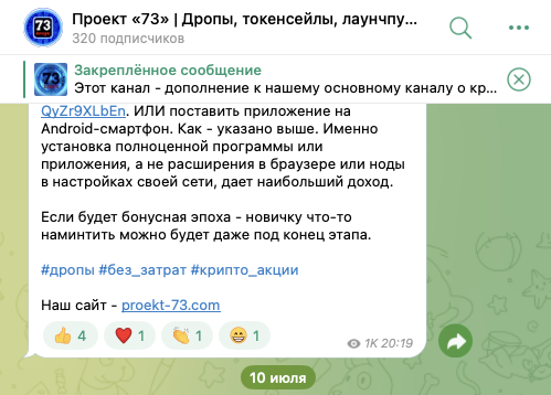 Proekt73 — это группа информационных ресурсов, владелец которых рассказывает о способах заработка на участии в крипто-проектах. Он зарабатывает на партнерских программах.