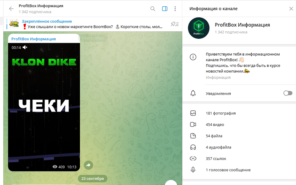 Финансовая пирамида активно разрослась не только по разным доменам, но и по социальным сетям. В Телеграме основной информационный канал ProfitBox привлек 1300 подписчиков. Лента доступна исключительно по пригласительной ссылке с официального сайта, которая регулярно обновляется. В ленте публикуются отчеты о переводах, а также анонсы вебинаров с частотой 2-3 раза в неделю.
