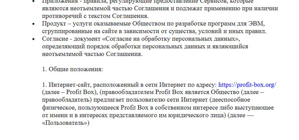 Есть проблемы и с официальной регистрацией. На сайте нет юридических данных о названии, идентификаторах компании или индивидуального предпринимателя, от имени которого оказываются финансовые услуги. Мы надеялись найти эту информацию в разделе с пользовательским соглашением. Но здесь предлагается присоединиться к договору с анонимным обществом. Работа без лицензии, регистрации – прямой сигнал, что “ПрофитБокс” – лохотрон с высокими рисками потерять депозит.