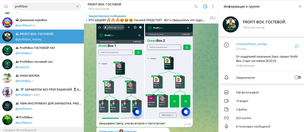 Также в Телеграмме есть пару десятков чатов, вроде ProfitBox Money, созданных топовыми кураторами. Их задача стимулировать инвесторов активней нести жуликам деньги.