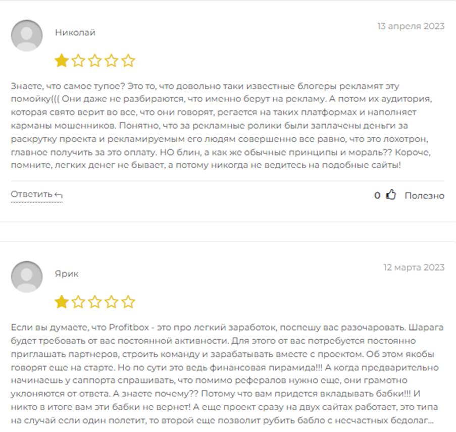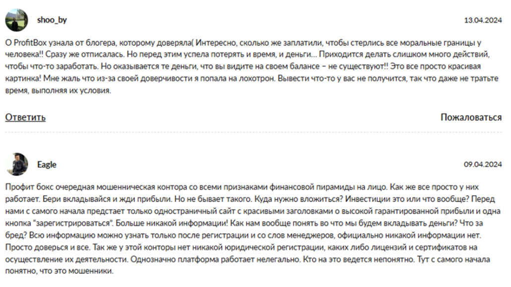 Вне социальных сетей, контролируемых жуликами или заинтересованными лицами, нет хороших отзывов о “Профит Бокс”. Негативный фидбек начал появляться сразу после запуска сайтов, и это еще одно свидетельство о нечистоплотности конторы. Клиенты заявляют, что после прикормки несколькими выплатами, они не смогли вывести свой депозит и полученный доход, даже если привлекли достаточное количество рефералов.