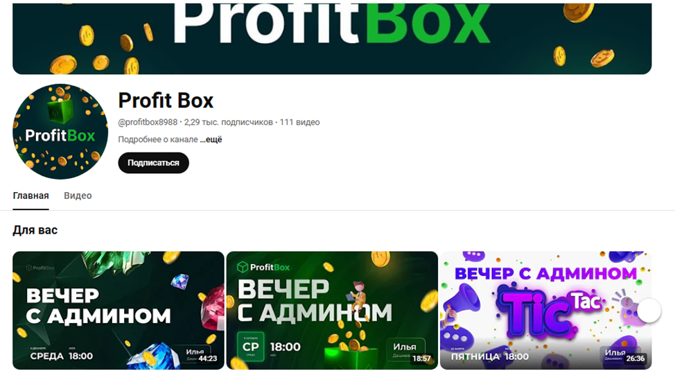 Видеоконент, состоящий из рекламных роликов и туториалов, размещается на ютуб-канале Profitbox8988. Ролики не собирают большую аудиторию, а на профиль подписано 2,3 тыс. человек, что нельзя считать успехом для компании, заявляющей о 58 тыс. активных клиентов.