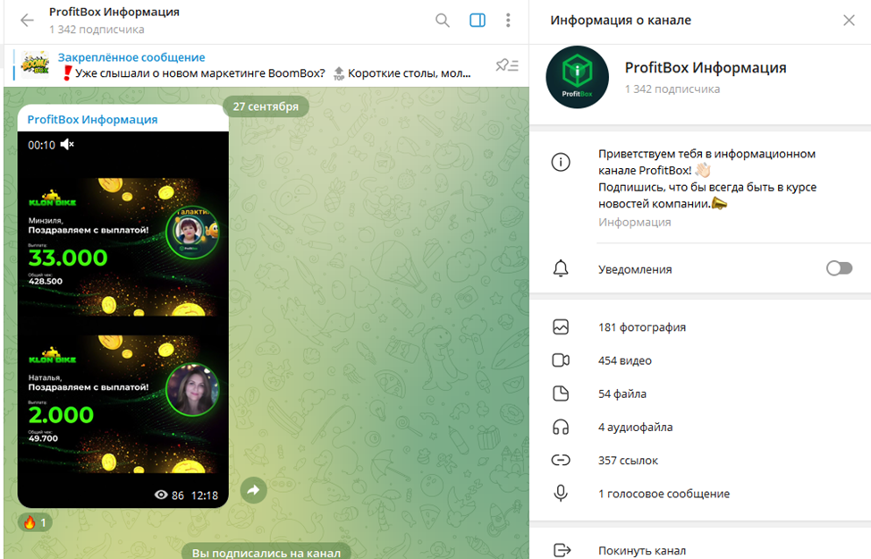 27 сентября 2024 года в основном телеграмм-канале “Профит Бокс” появился ролик с поздравлениями успешных инвесторов, сумевших вывести деньги.
