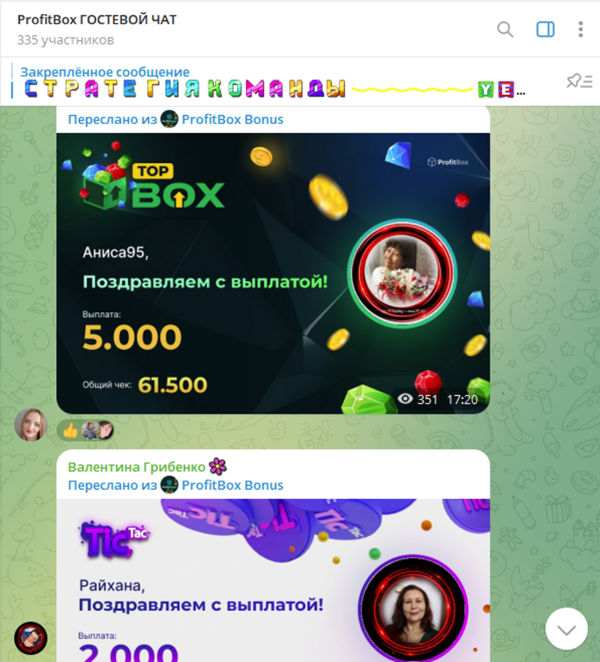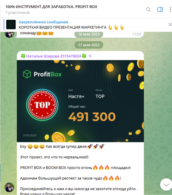 Во многих телеграмм-чатах, созданных участниками пирамиды, публикуются отчеты с выплатами денег, причем скриншоты непосредственно с переводами от “Профитбокс” датируются 2023 годом. В 2024 году все подобные посты связаны с брендами Tic Toc и TopBox, работающими по аналогичной схеме под руководством тех же аферистов.