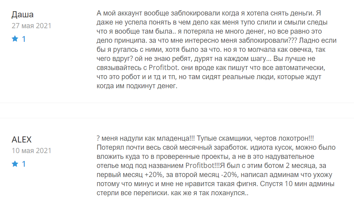 С повышением активности платформы стали появляться и негативные отзывы о Профитбот. В них клиенты жаловались на блокировку аккаунта и обман со стороны инвесторов. Люди отмечают, что в период сотрудничества не то, что ничего не заработали, а даже ушли в “минус”.