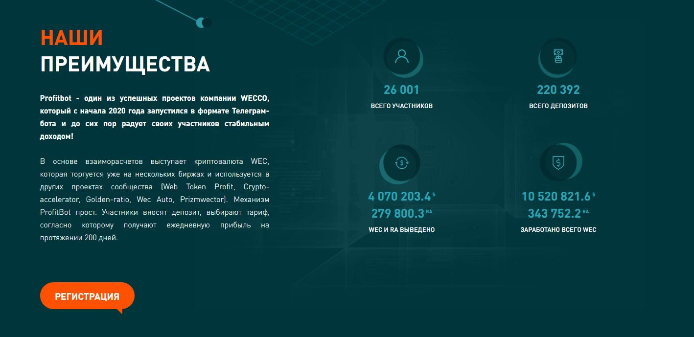 Профит бот — инвестиционный проект, представленный в начале 2020-го и предлагающий быстрый заработок в размере до 0.8% в сутки. Гарантирует безграничный доступ к ликвидным цифровым активам и честность выплат. Ниже разберем подробнее проект WECCO, его особенности и последствия сотрудничества для клиентов.