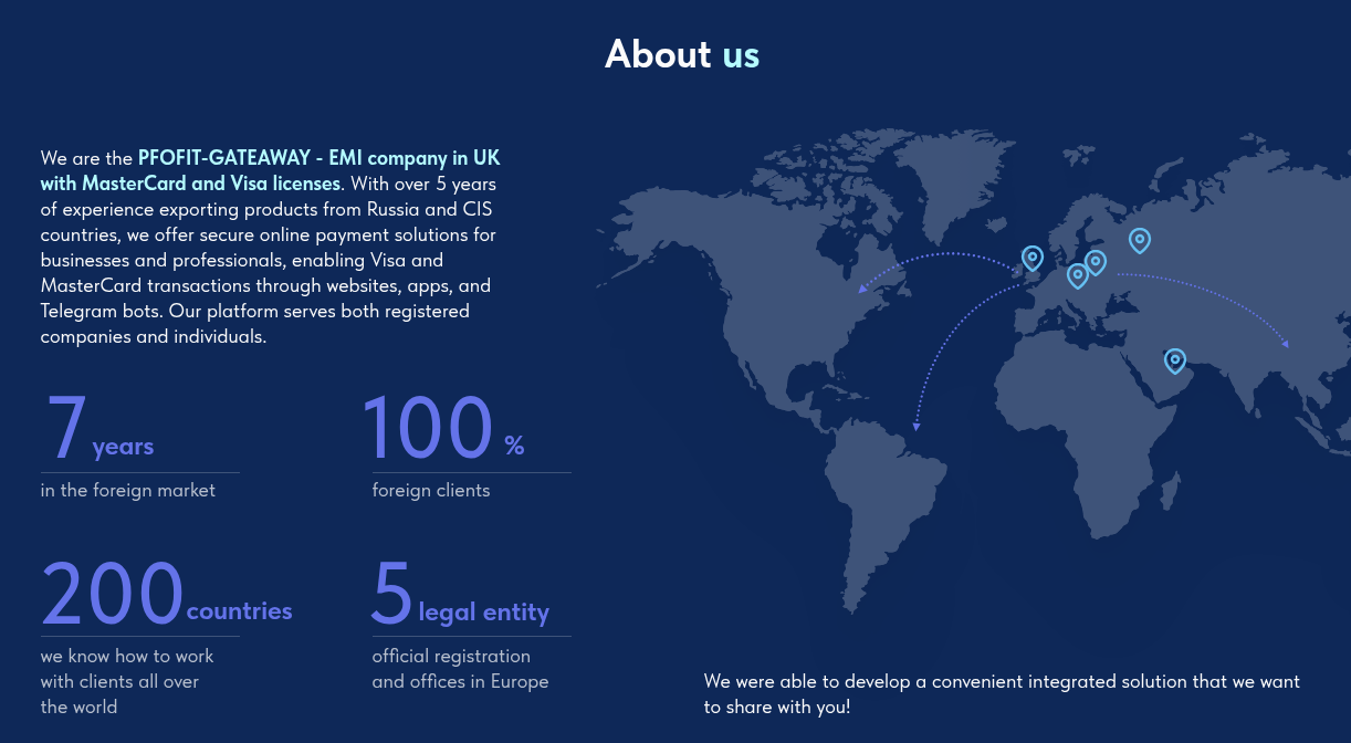 Profit Gateway — сервис интернет-эквайринга, позволяющий принимать платежи по картам Visa и Mastercard, а также через СБП и МИР. Дополнительно предлагаются международные переводы из России за рубеж. На сайте указано, что компания работает на зарубежном рынке более 5 лет и имеет официальную регистрацию и офисы в Европе.