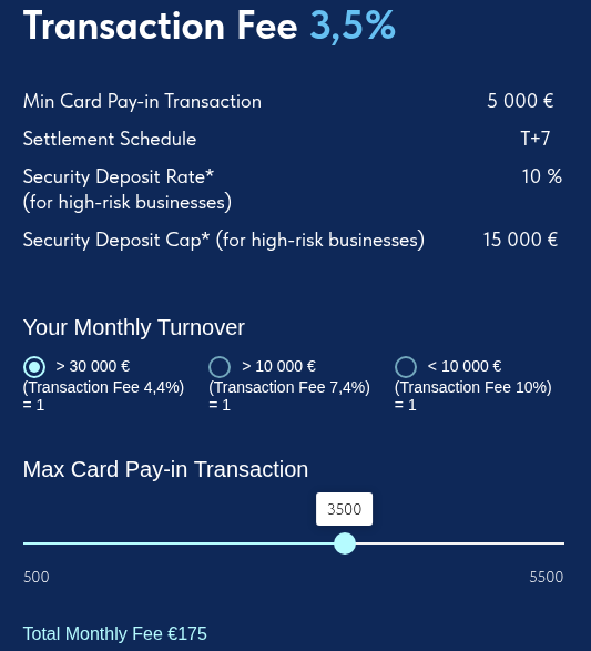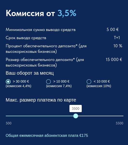 - Базовая комиссия — 7% при обороте до 10 000 евро в месяц.
