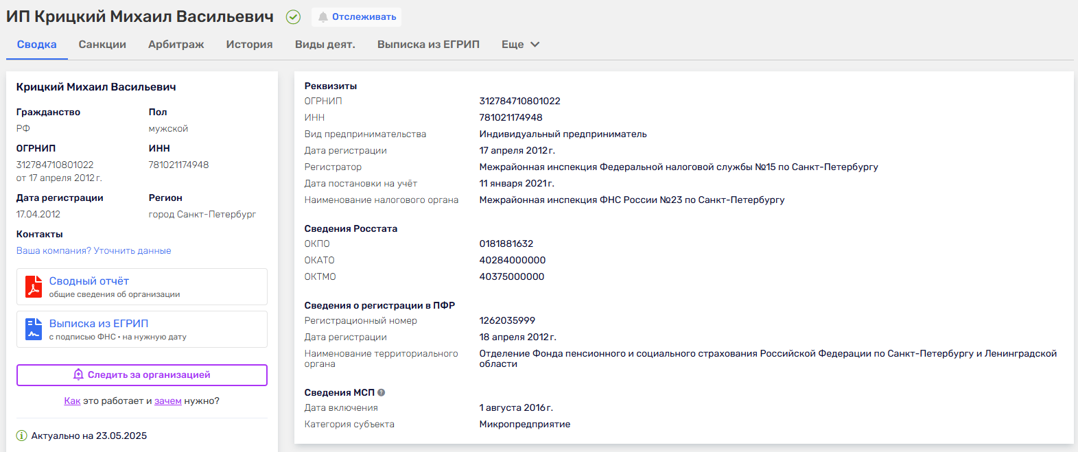 Особое внимание стоит уделить пользовательскому соглашению на сайте, поскольку в нем содержится важная юридическая информация. Судя по нему, основателем проекта выступает индивидуальный предприниматель Крицкий Михаил Васильевич. В медиапространстве информации о нем нет, но все прозрачно в реестрах госорганов.