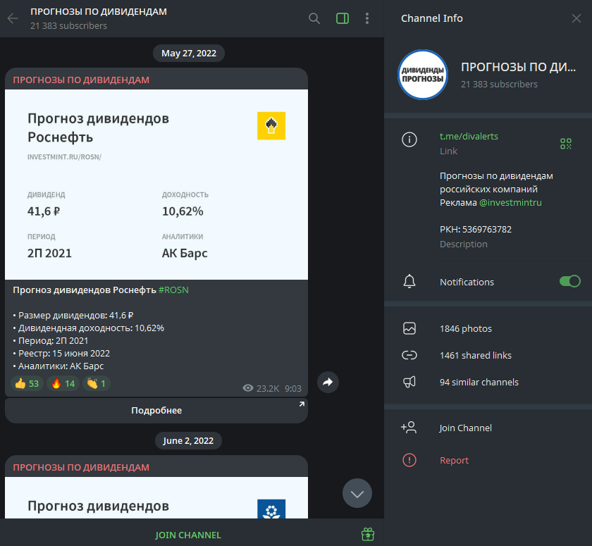 Обзор посвящен названному каналу с прогнозами по дивидендам в Телеграмме. На него подписаны 21.3 тысячи пользователей, а публикации набирают по несколько тысяч просмотров. Это может свидетельствовать о том, что накрутки здесь нет.