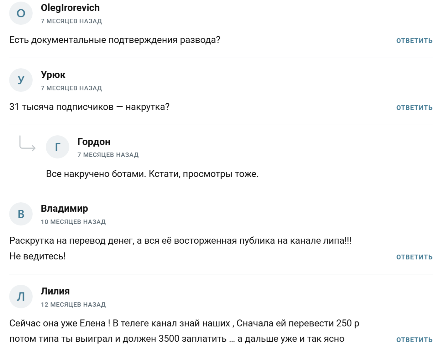 В отзывах отмечается, что канал является мошенническим. Аферистка накручивает канал с помощью ботов и не платит деньги. Многие клиенты повелись на обещания, но в итоге остались без денег. Также отмечается, что автор канала постоянно меняет имена, чтобы запутать следы и избежать ответственности в случае жалоб со стороны клиентов.