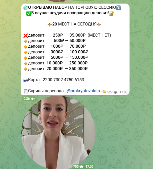 Известно, что девушку зовут Violetta Belitskay, но с большой долей вероятности это имя — подделка. В период работы канала героиня обзора предлагала быстрое увеличение депозита. Пользователям нужно было внести небольшую сумму от 250 рублей, чтобы на выходе получить в 10-15 раз больше. Инвестированные деньги Виолетта вкладывала в криптовалюту, что позволяло иметь быстрый доход.Чем больше денег клиент инвестировал, тем крупнее выплаты он получал. На выбор предлагалось вложение на сумму 250 или 500 р, а также 1, 3, 5 или 10 тыс. рублей соответственно. Сумма на выходе при этом составляла от 35 до 350 тыс. рублей. Понятное дело, что реальных подтверждений таких платежей никто не приводил.