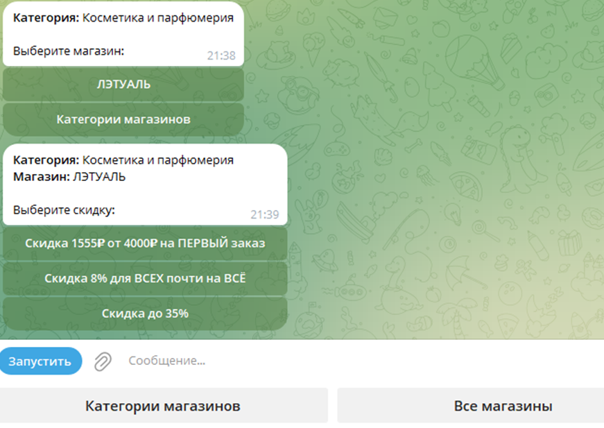 После выбора категории бот выдаст список доступных магазинов или компаний, которые на данный момент предлагают скидки и промокоды. Ваша задача выбрать нужный.