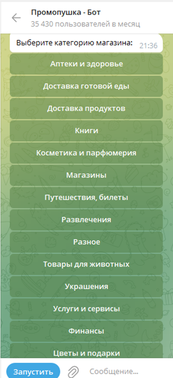 Пользоваться ботом «Промопушка» очень просто. После запуска пользователь должен выбрать категорию магазина, их перечень представлен на фото ниже.