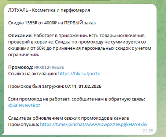 Второй – информационный канал, где публикуются уведомления о новых промокодах. Примечательно, что у канала довольно много подписчиков – порядка 18 000. Здесь админы оперативно публикуют оповещения о новых промокодах и скидках со ссылками на сайты.