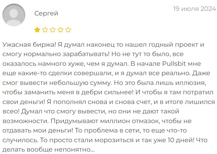 Ни одного положительного момента в работе Pullsbit нет. Такая «биржа» не подходит для трейдинга или инвестиций в крипту, на ней можно только расставаться с депозитами.