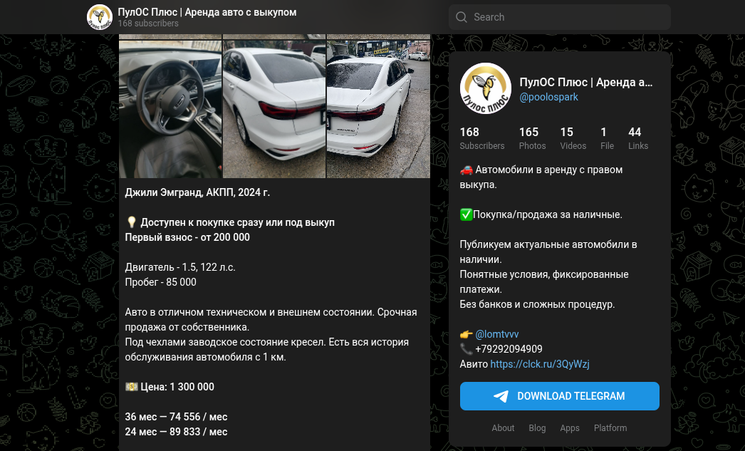 Платформа «ПулОС Парк» позиционирует себя не просто как таксопарк, а как экосистему. Основной канал коммуникации – Telegram. Если полистать их ленту, складывается впечатление, что мы попали на какой-то «волшебный» авторынок. Там постоянно выкладывают лоты: Geely, Chery и прочие чудеса китайского автопрома по слишком уж привлекательным ценам. Тут на ум приходят два варианта развития событий: