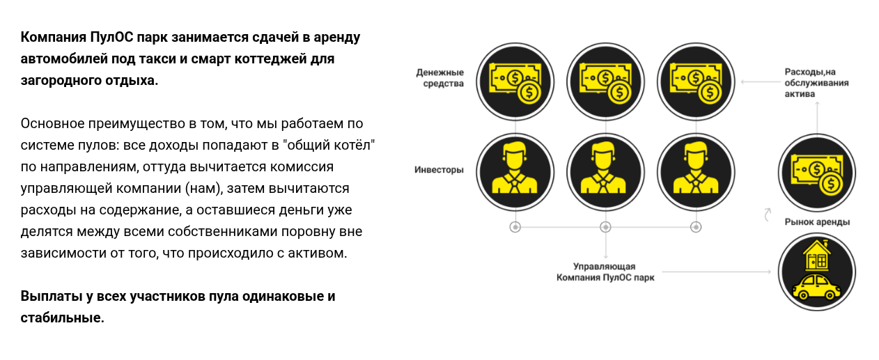 Суть же предложения сводится к покупке авто (или доли в нем) для сдачи в аренду водителям такси. Но, опять же, есть нюанс: инвестор не получает конкретную машину с VIN-номером, которая стоит у него в гараже. Он вкладывается в «пул». Деньги вкладчиков сливаются в общий котел, на них покупается техника, а прибыль «размазывается» по всем участникам пула.