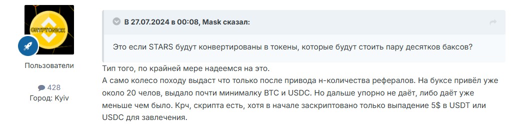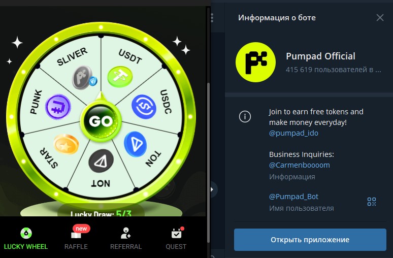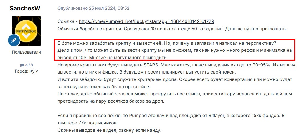 Если говорить о боте Pumpad Official Bot, то это колесо фортуны, крутя которое пользователь получает монеты. Все вроде бы легко и понятно. Если бы не одно «но». Как только дело доходит до выплат, появляется куча скрытых условий. Для начала нужно привлечь рефералов, далее поделится заработком в Твиттере. Выполнив задания и накрутив статистику мошенникам, клиент узнает, что есть минимальные ограничения по сумме. Потом появляется платная верификация кошелька и другие причины не выплачивать деньги.