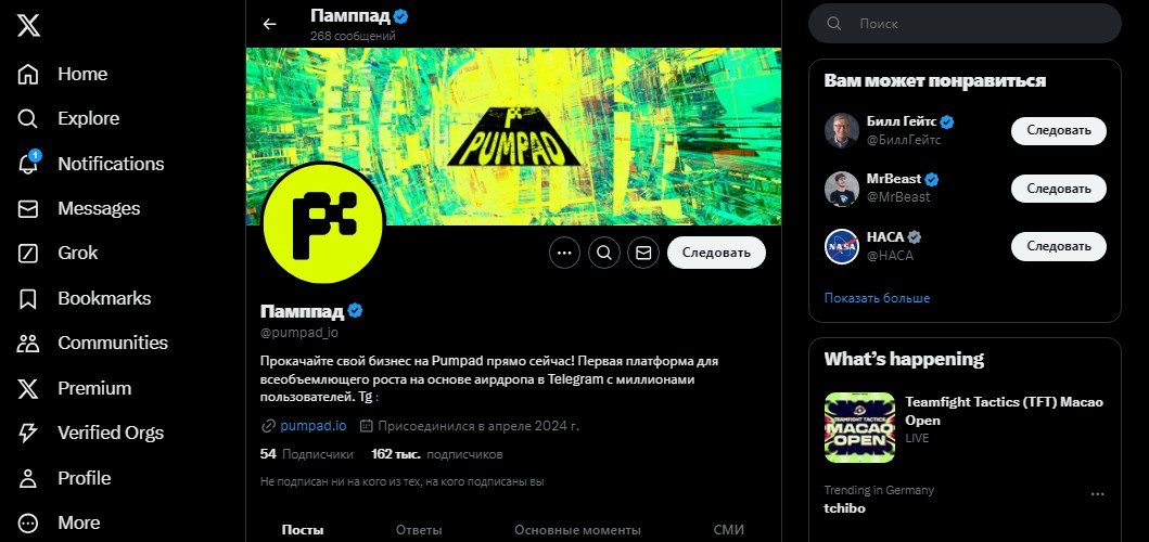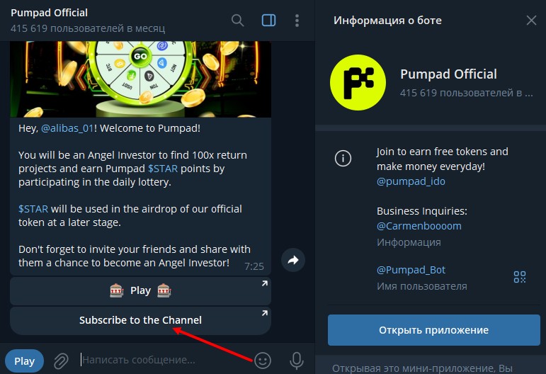 Основной канал проекта – Pumpad Official Announcement. На него подписано более 1,5 млн пользователей. Однако, просмотры составляют лишь 10% от аудитории. Это может говорить о накрутке или пассивности подписчиков. В Telegram публикуются анонсы розыгрышей, инструкции для Pumpad Bot и реклама сомнительных проектов