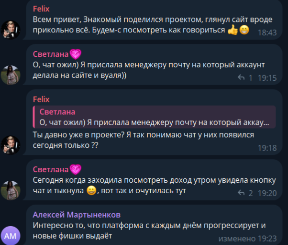 - Телеграм чат модерируется и поддерживает активность исключительно за счет ботов на основе ИИ