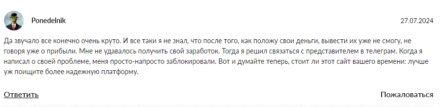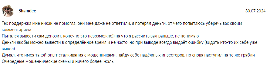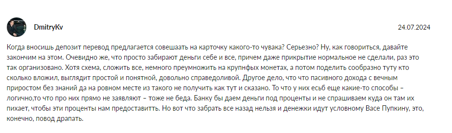 Такие проценты шикарные нарисовали, а подтверждений, что я смогу вывести потом свою прибыль, не удосужились предоставить. Хотел уже было рискнуть, пополнить депозит, но когда увидел, что деньги надо переводить на карту физлица, то сразу же передумал. Это ж явный признак мошенничества.