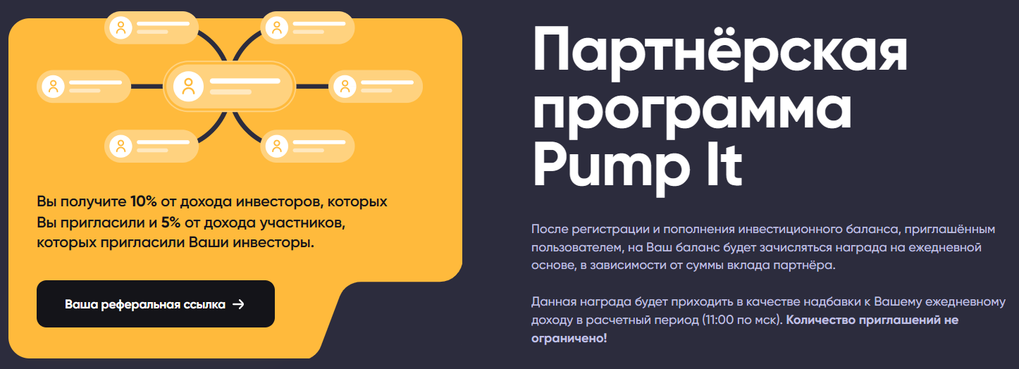 Платформа памп ит — это проект, предлагающий вложить свои сбережения под процент, составляющий от 3,2% до 13% ежедневно. Однако само тело депозита вывести — невозможно. Соглашаясь на их условия, вы получаете доход который складывается только из указанного процента.