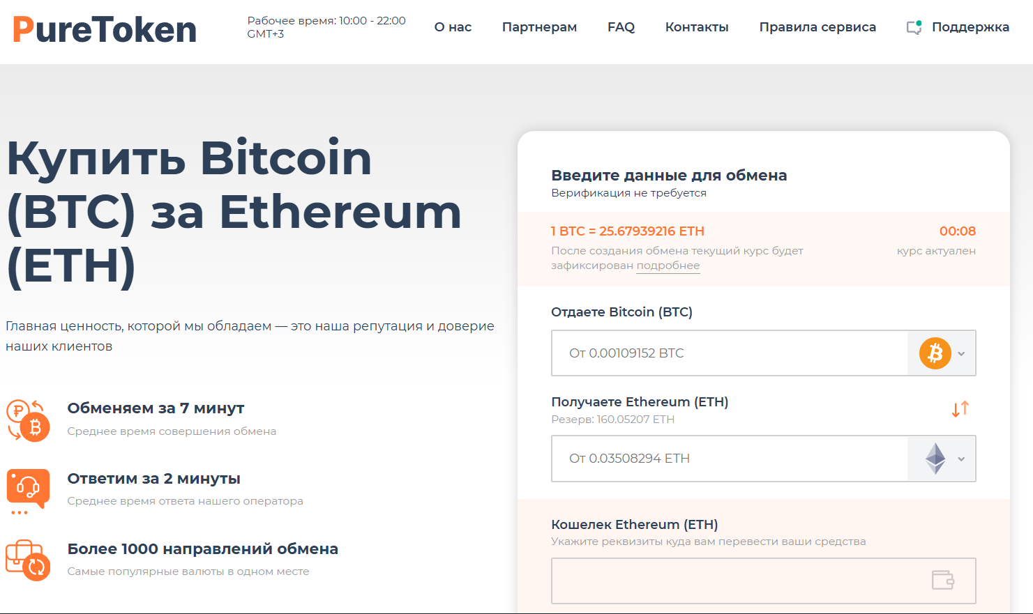 Техническая поддержка, которая работает через Телеграм, должна отвечать максимум через 2 минуты. Но она доступна не круглосуточно, а работает только с 10 до 22 часов. На другой странице написано, что специалисты круглосуточно наблюдают за работой сервиса. Также на сайте указано, что обменник Puretoken net предлагает более 1000 направлений обмена. Если сложить все указанные на данный момент варианты, то их оказывается менее 200.