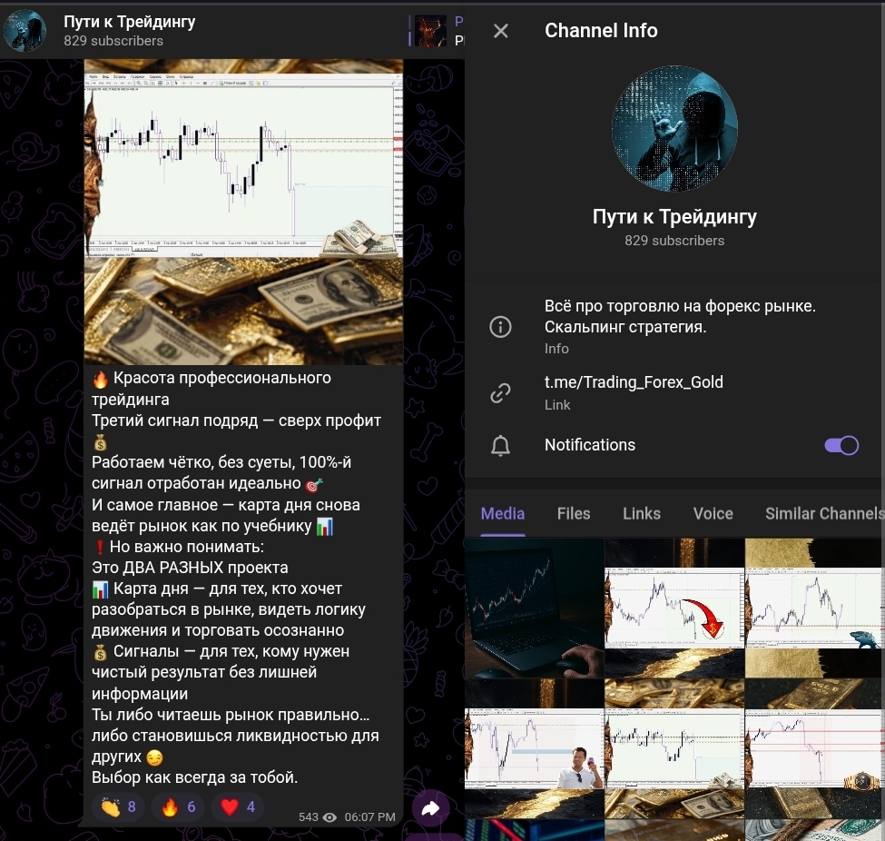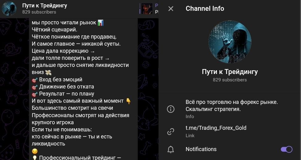 Пути к Трейдингу — это Telegram-канал с хендлом Trading Forex Gold, специализирующийся на торговле XAUUSD. На момент анализа аудитория канала составляла около 829 подписчиков. Автор канала публично не идентифицируется: аватар представляет собой фигуру в капюшоне, имя не раскрывается, биография отсутствует. Это первое, что фиксируется при базовой проверке.