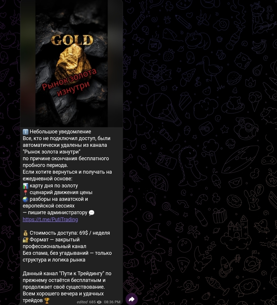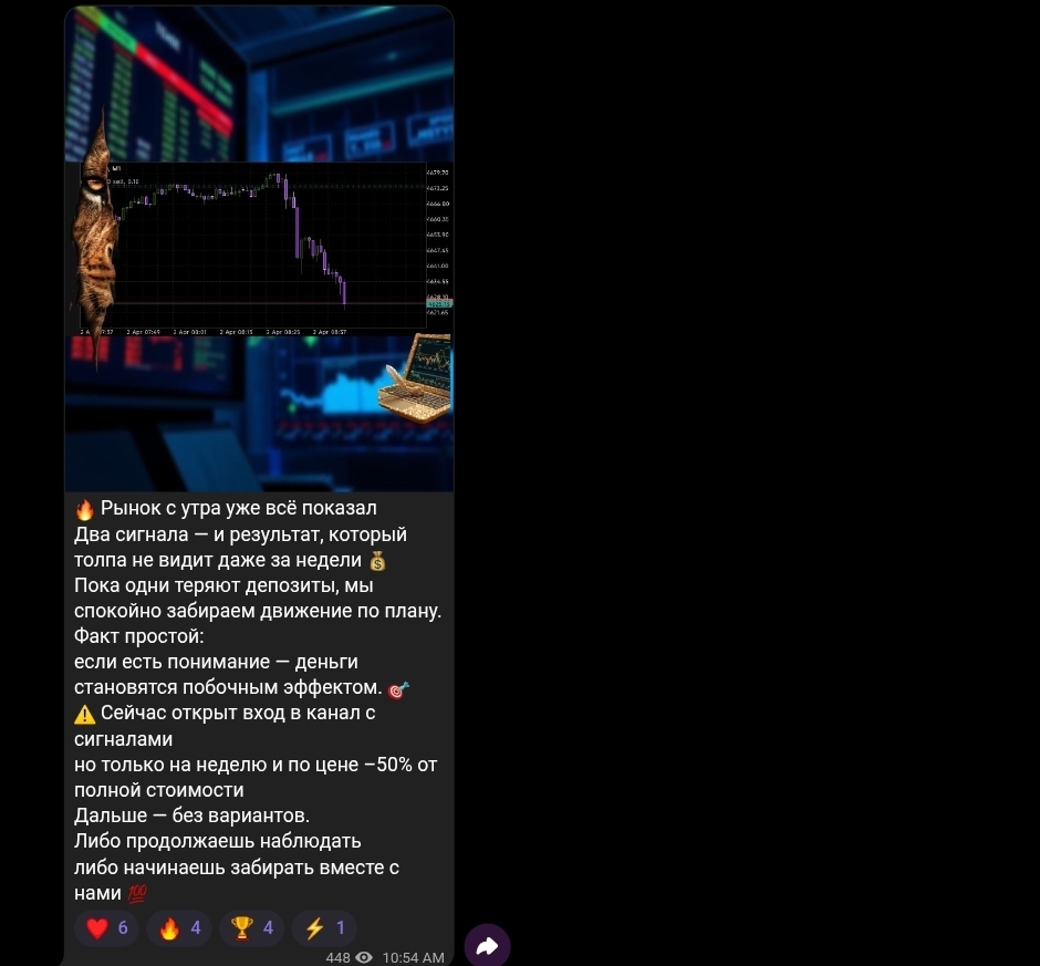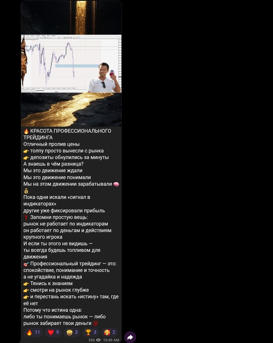 Контент канала строится по устойчивой схеме: публикуется скриншот графика XAUUSD с обозначенными уровнями, к нему прилагается мотивационный текст в духе «пока толпа теряла деньги, мы спокойно забирали своё». Проигрышные сделки в публичном канале не фигурируют. Подобная односторонняя подача — стандартная практика для каналов, монетизирующихся через продажу платного доступа: формируется образ «тех, кто всё знает заранее», а неудачные входы остаются за кадром.